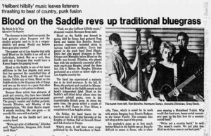 Blood on the Saddle is one of the latest additions to the Los Angeles rock scene that has spawned the countrified likes of the Gun Club, Rank and File and Lone Justice. Unlike any of them, Blood on the Saddle sticks to the bluegrass side of things and revs up the music to a pace that often prompts many a club patron to thrash.