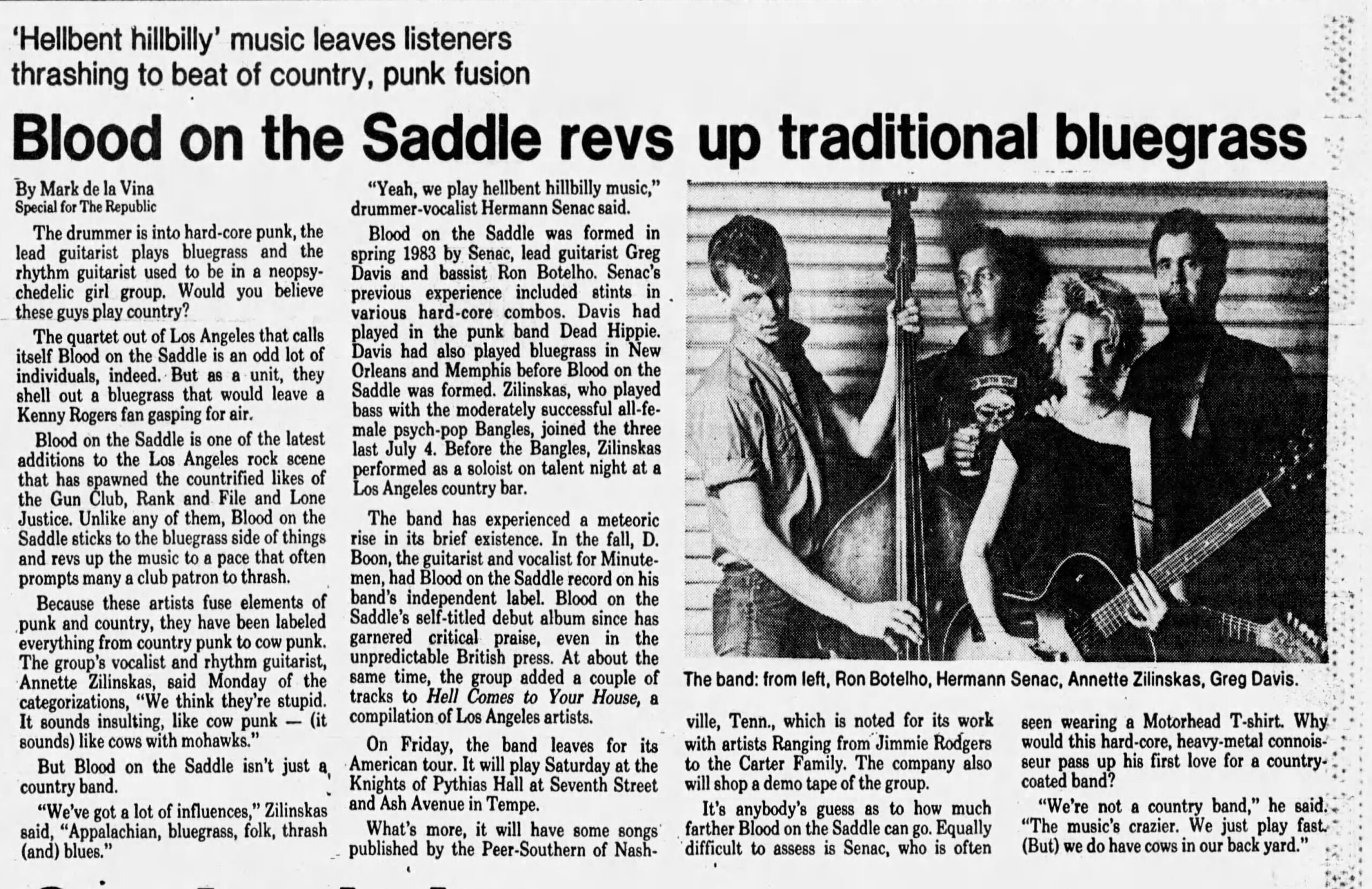 Blood on the Saddle was formed in spring 1983 by Senac, lead guitarist Greg Davis and bassist Ron Botelho. Senac’s previous experience included stints in various hard-core combos. Davis had played in the punk band Dead Hippie. Davis had also played bluegrass in New Orleans and Memphis before Blood on the Saddle was formed. Zilinskas, who played bass with the moderately successful all-female psych-pop Bangles, joined the three last July 4. Before the Bangles, Zilinskas performed as a soloist on talent night at a Los Angeles country bar.